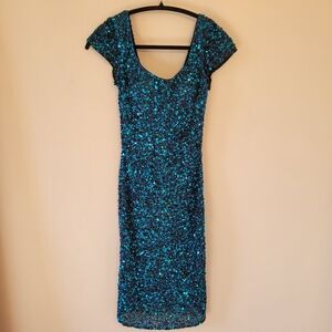Vintage Scala Blue Sequin 100% Silk Evening Cocktail Dress - Xs