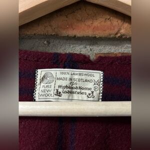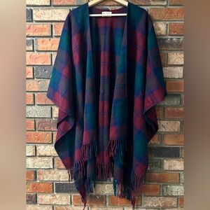 Wrap yourself in classic Scottish style with this vintage tartan poncho from Highland Home Industries. Made in Scotland from 100% pure lambswool, it features a rich plaid in deep red, navy, and green. The open-front, draped fit and fringed hem make it effortlessly stylish and cozy—perfect for layering all season long.