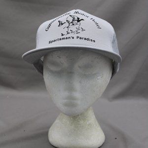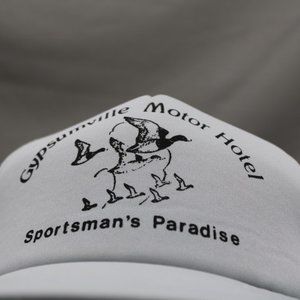 Up for sale is a vintage screened trucker hat. It has a grey base colour with black screened-on graphic. The graphic features a group of geese flying with Gypsumville Motor Hotel above and sportsnan's paradise below. What a great vintage hat do not miss out on it.