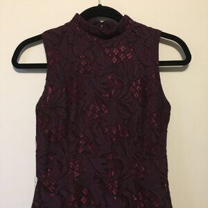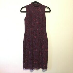 Very good preowned vintage condition deep burgundy/wine-coloured sleeveless, mock neck, sheath dress with full body lace and lining by Sears. This gorgeously made dress is a true vintage gem. The fringed bottom and floral lace gives this dress a eclectic feel for a flapper asian fusion.