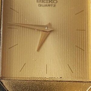 It has a gold-tone, rectangular case and a matching metal band. The face is gold-toned with simple stick hour markers and two hands. The brand name "Seiko" is visible on the dial. The watch has a classic, minimalist design.