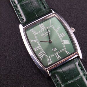 Crafted by Seiko, this slim tonneau tank watch is a unique addition to any collection. The leather band adds a touch of sophistication and elegance to the piece, while the customized design makes it truly one-of-a-kind.