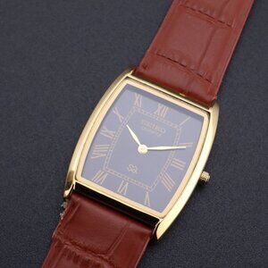Crafted by Seiko, this slim tonneau tank watch is a unique addition to any collection. The leather band adds a touch of sophistication and elegance to the piece, while the customized design makes it truly one-of-a-kind.
