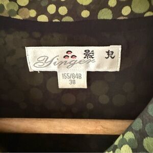 This unique vintage blouse features a semi-sheer fabric covered in varying shades of green circles. It’s finished with a dainty collar, a tie at the neckline, and charming eyelet button closures down the front. Perfect layered over a cami or bralette, or tucked into high-waisted trousers for a bold yet breezy look. In excellent pre-owned condition.