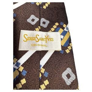 28Crafted with the discerning gentleman in mind, this vintage Serge Saint Yves tie adds a touch of classic sophistication to any ensemble. Its elegant brown palette is complemented by subtle pale blue and yellow accents, creating a versatile piece that's perfect for both professional and social occasions. Made to cater to the sartorial needs of the modern man, this tie hails from a storied past, embodying the timeless style synonymous with the Vintage brand. Whether it's for daily wear or a special event, this tie is sure to elevate your attire with its refined aesthetic.