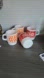 Wonderful set of four Fire King mugs daisy graphics in red and orange checkered dot pattern. They feature the pointed D shaped handle and are stackable! The back stamp “Anchor Hocking Symbol Oven Proof Made in U.S.A” dates these to the 1960’s - 1970’s. Wonderful addition for collectors / display this Christmas!