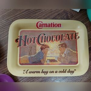Vintage* 4 Carnation Hot Chocolate Advertisement Trays. Small. Tin. Excellent for change or keys. Can b framed. Orange. Yellow. Green. Purple. Each features different scenes. Excellent condition. Collectible set.