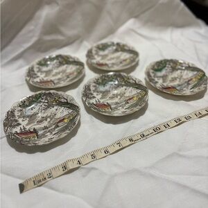 Set of five ceramic plates with scenic design. Features red, yellow, and green accents. See photos for wear