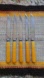 Set of five steak knives with vibrant yellow handles. Perfect for adding a pop of color to your dining table.