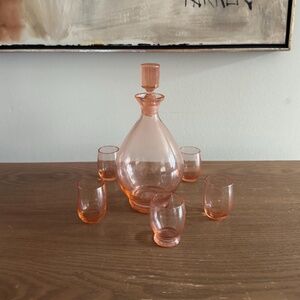 Vintage Set of 6 • Pink French Round Glass Medium Decanter + 5 Shot Glasses