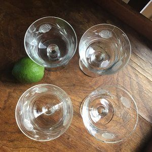 Vintage Set of Four Etched Rose Stemmed Cocktail Bar Glasses