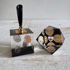 Vintage Set of Two Acrylic Paperweight with Pen Holder and Paperweight