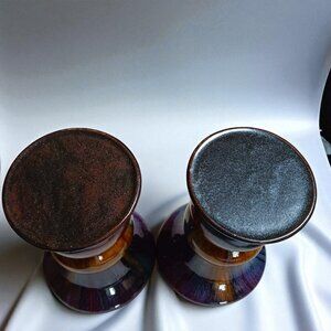 Vintage Set of Two Flambé Ceramic Candle Holders Pair Purple Blue Orange Pillars