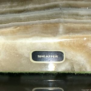 Vintage from the1960’s pen holder with Sheaffer tag on it. This is a beautiful vintage double pen holder made with tan and ivory. There are two brass penholders it is in good used condition