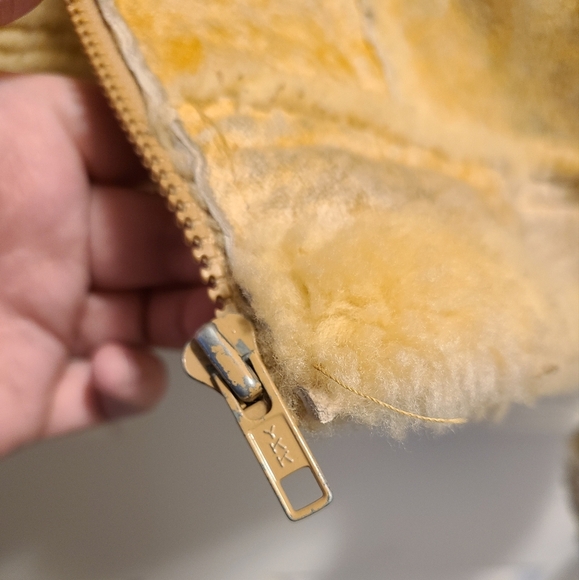 Beautiful vintage leather jacket with sherling lining is a sign of past quality. Made in 1970s or early 80s, mens size 40. Has signs of wear on leather, particularly under the arms, and a small tear on one cuff. Also, it has what appears to be some water staining (potentially rain drops). There are a few loose threads, typical given its age, and the leather on outside of the pockets (inside the jacket) has dried out considerably. A good all-over cleaning & leather conditioning would help bring it back to gorgeous. 👌 The lining is in good condition, with no holes, rips, stains, etc. It's a one of a kind piece. It just needs some TLC. Please review the photos carefully for condition.