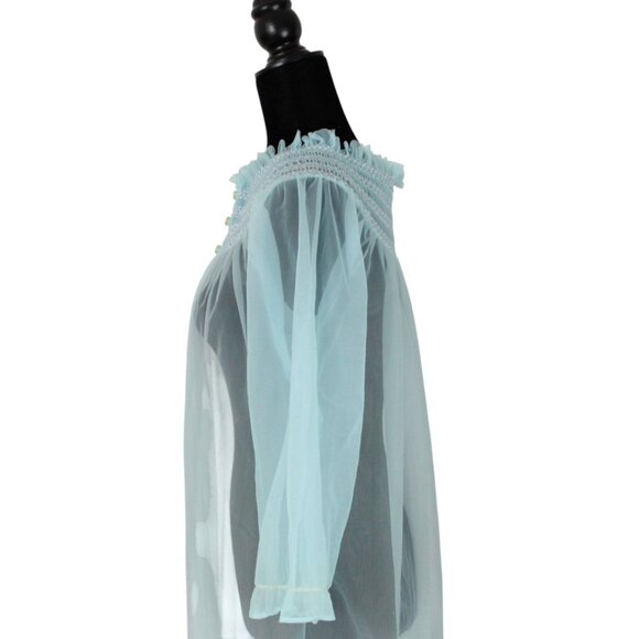 Vintage sheer cyan-blue dressing gown. This boudoir robe has a gorgeous smocked and ruffled collar and button closure. Long sleeve see-thru lingerie is labelled size small by Queentex. Some small runs in nylon. Elastic at the wrists is degraded due to the age of the piece. See photos for details.