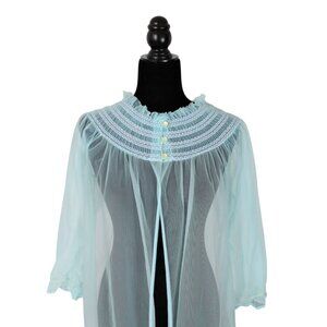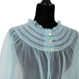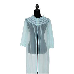 Vintage Sheer Cyan Blue Dressing Gown Queentex Lingerie Robe Smocked Collar N84