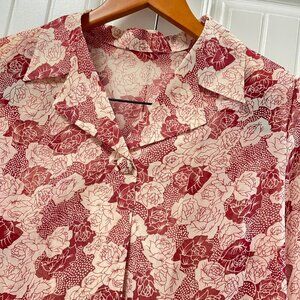 A romantic and breezy vintage blouse featuring a red and white floral rose print on a lightweight sheer fabric. The blouse has a soft, slightly oversized fit with a collared neckline, full front button closure, and subtle puffed sleeves with button cuffs. The warm red and ivory tones add a charming, timeless elegance perfect for both casual and dressy looks.