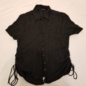 Vintage Sheer Textured Paisley Jacquard Print Black Button up Rouched Tie sides Cropped Fit Shirt Womens Tee