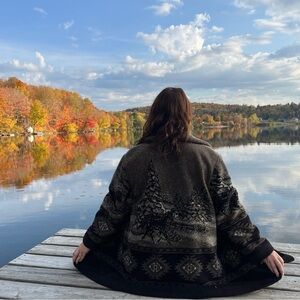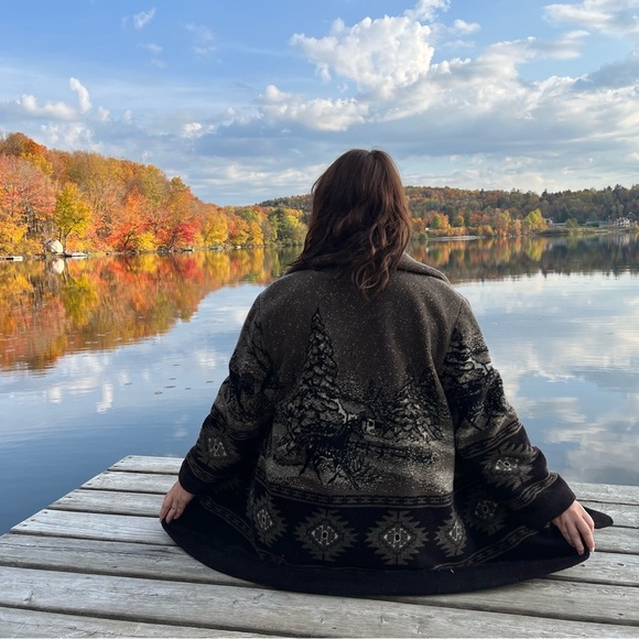 Cozy jacket with a scenic nature design. Features black green and gray tones.