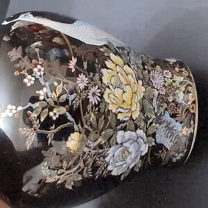 Vintage Shibata Japanese mini black lidded porcelain ginger jar with peacock and cherry blossom design.