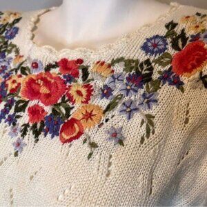 Vintage Short Sleeve Lightweight Hand Embroidered Open Knitted Sweater Size L