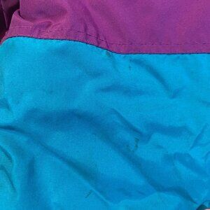 This jacket features the iconic 90s color duo of purple and teal. There is an embroidered Shaw Cable patch on the chest. One of the pocket zippers is off one of the tracks as shown. There are multiple stains mainly on one of the sleeves. Please see measurements as vintage piece tend to run small.