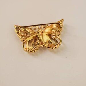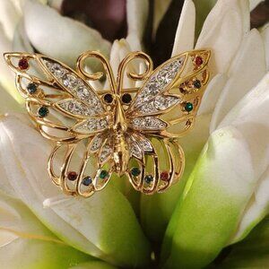This is a vintage D'ORLAN butterfly brooch pin. It features a goldtone base with rhinestone crystal accents - clear crystal body, ruby red, emerald green and topaz blue crystals along the wings. The eyes are dotted with dark sapphire colour rhinestone crystals. The D"ORLAN mark is on the backside of the brooch.