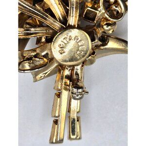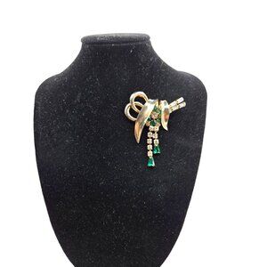 An absolute showstopper from Phyllis Scitarelli, this dramatic vintage brooch combines the glamour of rich gold plating with dazzling Austrian crystals. Featuring sparkling emerald green and clear rhinestones in a sweeping, ribbon-like spray design, this piece captures the bold elegance Scitarelli is known for.