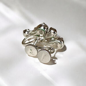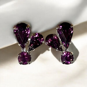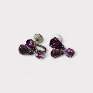 An elegant pair of screw back earrings. Each earring features three purple stones: two pear-shaped and one round. The metal appears to be rhodium-toned. The stones are securely set. The screw back mechanism is functional. Dimensions are approximately 3/4 inch in length. No damage or missing stones, overall very good vintage condition..