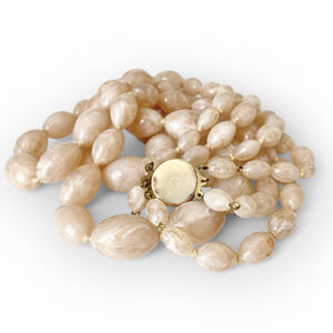 A lovely Vintage West German Three Strand Resin Plastic Bead Necklace. Handcrafted in West Germany, this necklace features three strands of nude and beige swirl resin beads that create a beautiful and modest design. The timeless design of this necklace make it a standout piece that will add a touch of elegance to any outfit. The beads are smooth and oval in shape each bead is hand-knotted and the clasp matches with the hallmark West Germany.