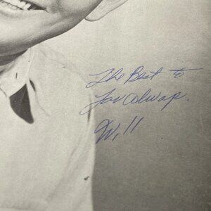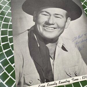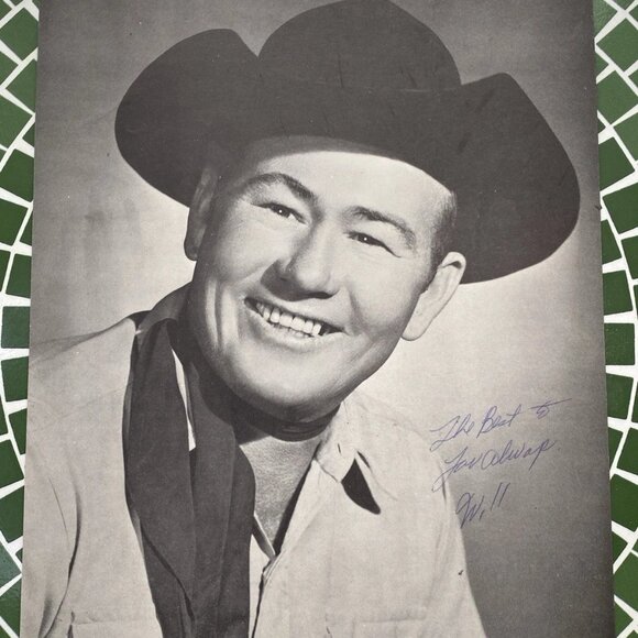Vintage black & white promotional photograph of country radio personality and performer Will Ray, host of “Kern County Kountry Time” on KPMC radio, Bakersfield, California. The photo features an original hand-signed autograph in blue ink with a personal inscription. A genuine piece of mid-century American country radio memorabilia.