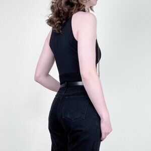 Features: Sleeveless, high crew mock neck, draped beading, cropped length