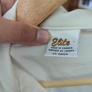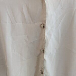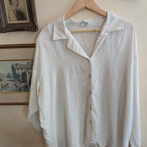 A cream, silken blouse with pearl and silver buttons. Fits M to L for a relaxed, oversized look and XL for a more fitted look. Unsure of the material.