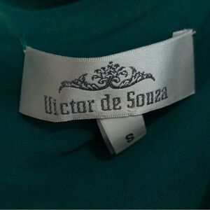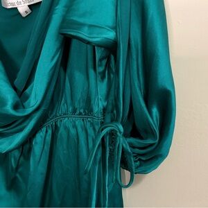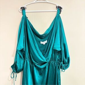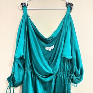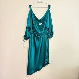 Vintage Silk Emerald Green Asymmetrical Draped Cocktail Dress Bead Cold Shoulder