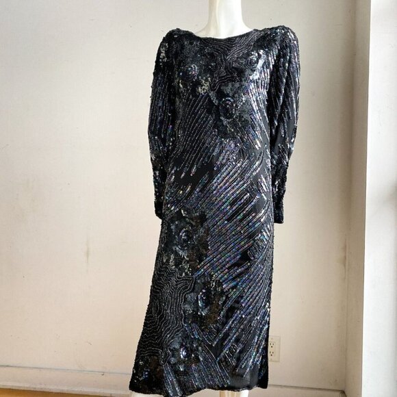 Vintage Silk Fully Beaded Geometric Floral Print Tunic Dress S