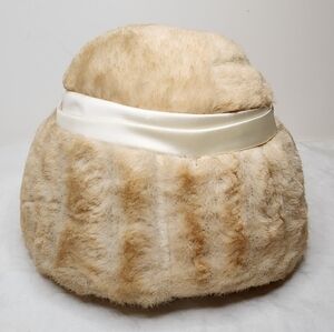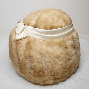 Light Cream & Tan Sheerling Wool Cloche Hat with layered Satin Bow with Rhinestones & faux Pearls, by FASHION Original Toronto.