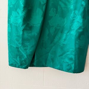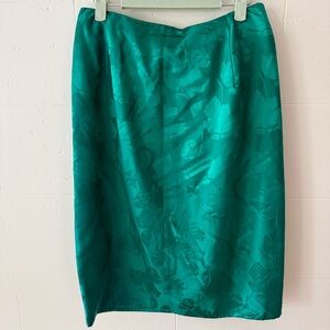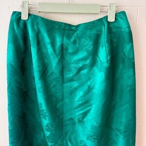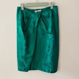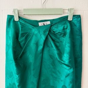 This vintage Flora Kung skirt is made from 100% pure silk and is like a daydream. Features a stunning emerald green leaf print and a flattering midi-length cut with a fold detail that adds movement and style. High-quality construction with a hidden clasp closure in the front for comfort and ease. Flora Kung was known in the 80s and 90s for bold prints and elegant silhouettes. This is one of those timeless pieces that feels just as special today. In excellent pre-owned condition.