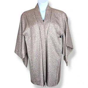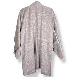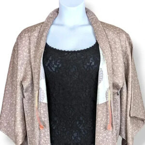 This beautiful vintage Haori (half-kimono) is made of silk inside and out. The exterior is pink with a small white floral pattern and the interior is white with light pastel flowers overlapping like clouds. There is a red and white string on either side of the front opening that can be tied to shut the front. The sleeves feel a little shorter than usual but have a large rectangular width typical of a kimono. This piece has not been worn and still has its basting stitches in place. Unfortunately, this was previously stored in such a way that there is a light line across the back where the fabric has faded (pic 2, pic 8).