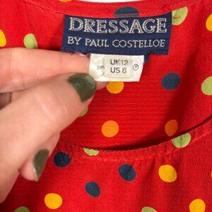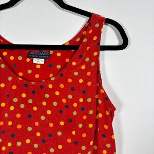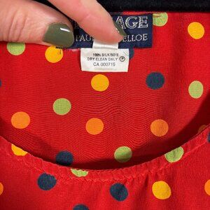 Vibrant vintage polka dot sleeveless top in a bold red base with playful multicolor dots. Lightweight Silk fabric with a relaxed fit. A cheerful retro piece that pairs beautifully with high-waisted jeans, skirts, or summer outfits.