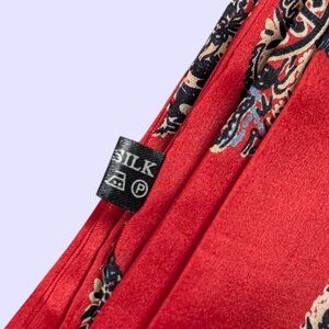 This vintage scarf was made in China out of 100% silk. The scarf is doubled with a satin finish, long fringe tassels, and has hidden machine stitches. The scarf also has circular dragon-like patterns throughout. The scarf has normal vintage wear, and the fringe could use a comb, but there are no issues that affect wearability.