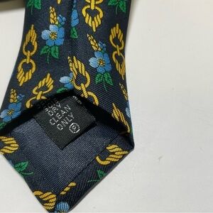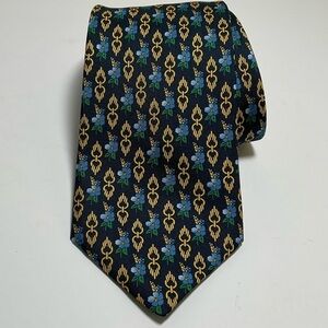 Gold yellow pattern on navy with blue hibiscus floral print vintage necktie. Quality brand, retro Men’s