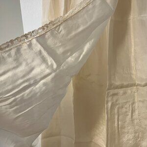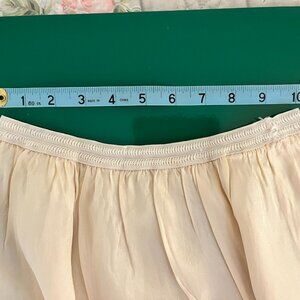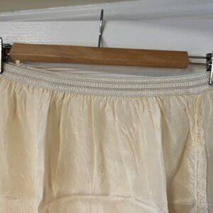 Elastic waist with a pretty lacy trim. Has a wrap effect with double layer in front.