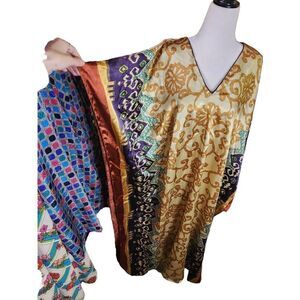 Vintage Silky Satin Polyester 70s Kaftan Print Gold Boho