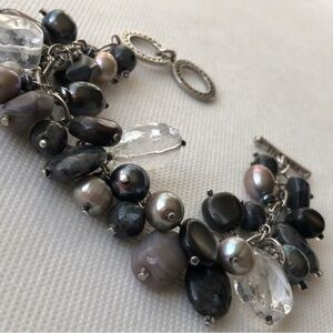 This exquisite Silpada bracelet showcases a captivating blend of black and gray beads, silver, pearls and hematite and onyx elegantly clustered on a silver-toned chain. The charm-style design features a mix of opaque and translucent elements, creating a sophisticated and versatile accessory for any occasion.