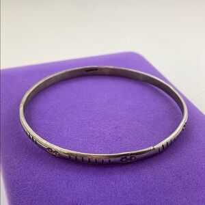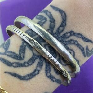 This elegant silver bangle bracelet adds a touch of sophistication to any outfit. Its sleek design and subtle detailing make it a versatile accessory for any occasion. Last photo shows it stacked with another bangle from my closet!