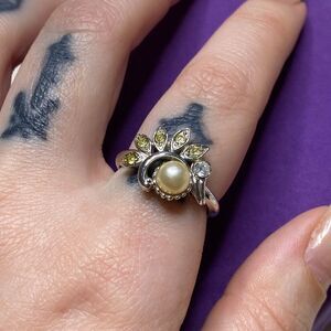💛 Vintage Silver Avon Fan Fare Pearl & Rhinestone Ring