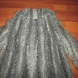 This stunning vintage Persian lamb (astrakhan) coat features the distinctive natural black-and-silver striped curls characteristic of Karakul lamb wool.