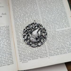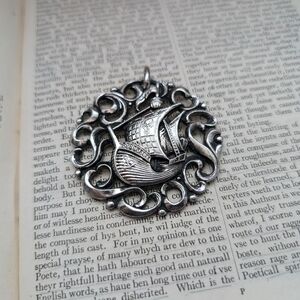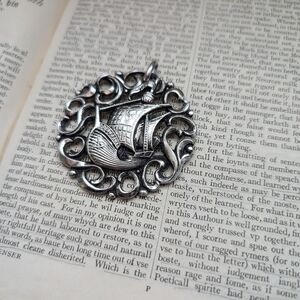 Intricate silver pendant with a nautical ship design. Perfect for adding a unique touch to any outfit.