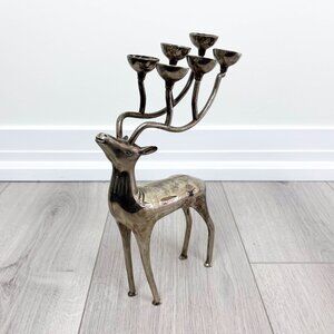 This is a stunning vintage-style silver reindeer candelabra featuring a sculptural silhouette and five candle holders integrated into its antlers. The piece measures approximately 12" tall and 8" wide. It shows some natural tarnish consistent with age, which can be polished to restore its original shine. A unique holiday centerpiece or year-round decorative accent for eclectic, vintage, or mid-century inspired spaces.